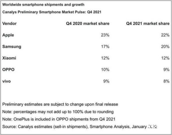而从2021年全年来看,三星仍然以20%的份额位居第一,苹果以17%的份额位居第二。对比2020年的数据可以发现,三星的市场份额没有变化,形成对比的是,苹果从16%到17%,国产厂商小米、OPPO、vivo分别从12%至14%,从9%至11%,从9%至10%。