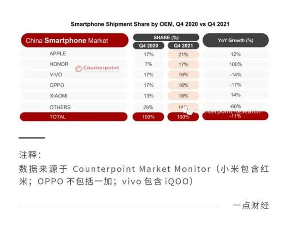 至少从第一个目标来看,“HONOR CAN DO”。根据Counterpoint Research Market Monitor最新数据,2021年第四季度中国智能手机出货量同比下降11%,苹果位列第一,并达到其有史以来最高的市场份额(21%),荣耀首次升至第二(17%)。