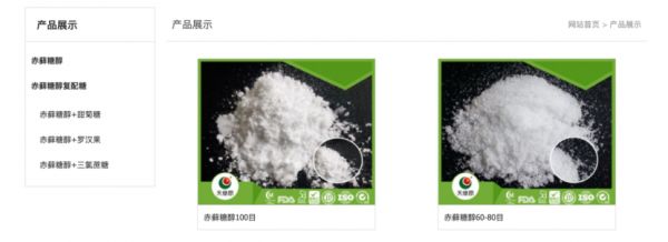 官方资料显示,三元生物是以“发酵法生产赤藓糖醇项目”为依托成立的一家集科研、生产、销售为一体的生物高新技术企业,在三元生物的产品展示页面,只有两类产品:赤藓糖醇和赤藓糖醇复配糖。