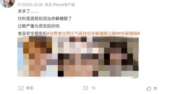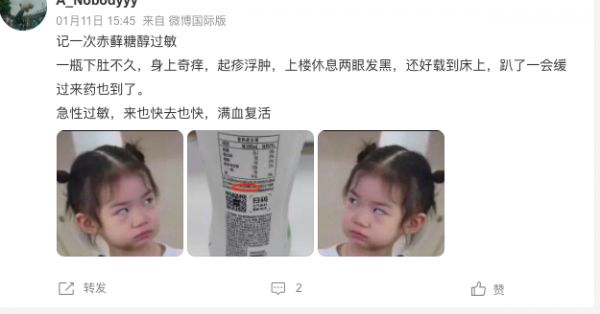 微博名为“小朋友kelsey”表示“第三次喝元气森林全身荨麻疹”,元气森林官方在下方回复“应该是对赤藓糖醇过敏?”,疑似佐证赤藓糖醇易引起过敏。此外,微博用户“Ale呀”也曾在微博中分享其食用赤藓糖醇过敏,并附过敏照片。