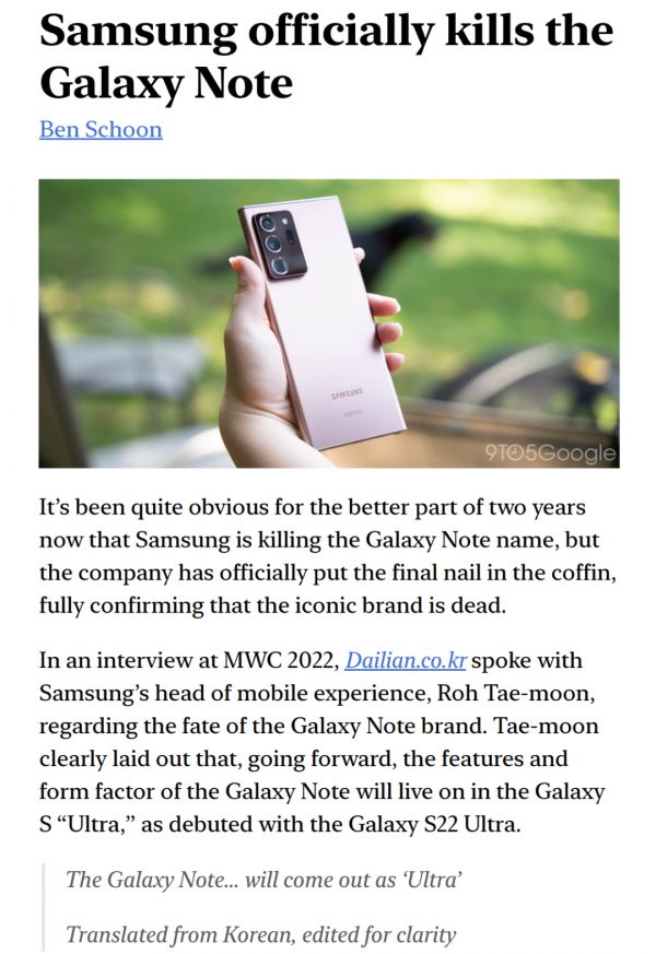 时间来到2022年的3月1日,PhoneArena、9to5Google等媒体报道,三星高管在MWC2022活动上回答有关Galaxy Note机型未来的时候如此回应:“The Galaxy Note… will come out as ‘Ultra’.”