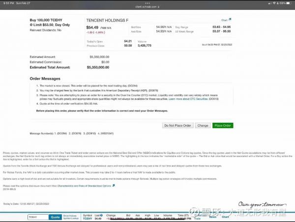 不只是说说,段永平还晒出了“下单”记录:他于美东时间2月28日12时55分,以53.50美元的价格买入10万股腾讯控股ADR(美国存托凭证),交易总金额为535万美元。