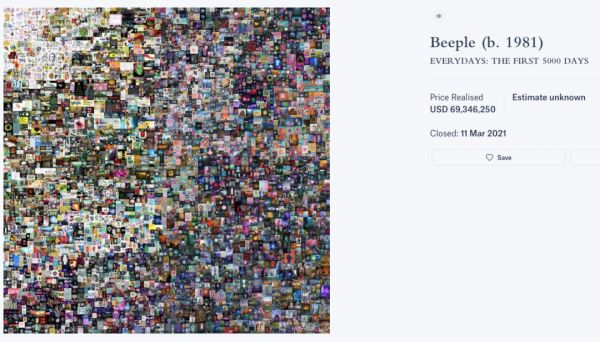 拍品是一幅巨型拼贴作品,由数字艺术家 Beeple 将 2007 年 5 月以来每天创作的 5000 张数字图片按时序粗略排列拼凑而成,名为《Everydays:The First 5000 Days》。据媒体报道,这幅拍品从 100 美元起拍,上架后一个小时内价格攀升至 100 万美元,历时 15 天,经过 353 口叫价,最终以近 7000 万美元成交落锤。