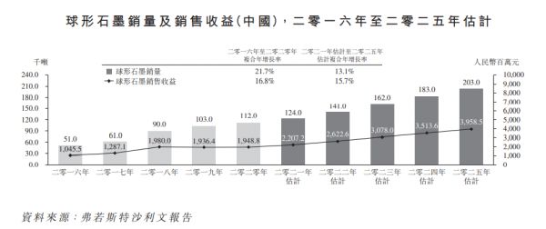 据弗若斯特沙利文报告显示,过去五年,中国球形石墨销量按复合年增长率21.7%高速上升,由2016年的51,000吨大幅增至2020年的估计数量112,000吨。与之相似的是销售收益亦受益于庞大市场需求,由2016年的1,045.5百万元升至2010年的1948.8百万元,同期复合年增长率为16.8%。预计至2025年,中国的球形石墨销量将激增至203,000吨,销售收益增长至3958.5百万元。