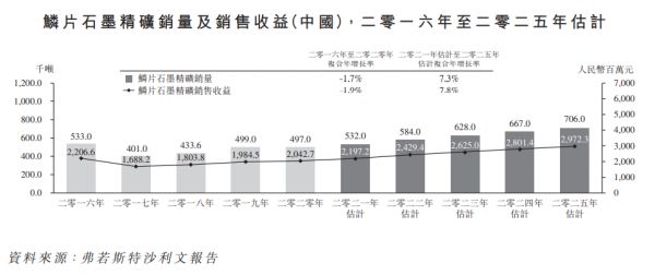 据弗若斯特沙利文报告显示,自2017年以来,中国鳞片石墨精矿的销量及收益均稳步增长。鳞片石墨精矿销量于2020年达到497,000吨,销售收益则于2020年达到2042.7百万元。