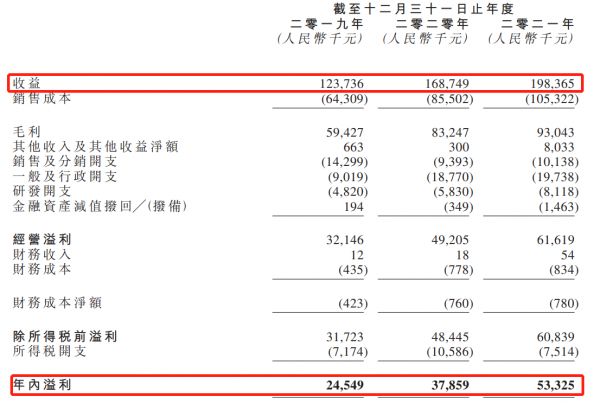 据招股书数据显示,2019年至2021年,该公司实现收入分别为1.24亿元、1.69亿元、1.98亿元,逐年提升;同期实现净利润则分别为2454.9万元、3785.9万元、5332.5万元,亦不断增长。