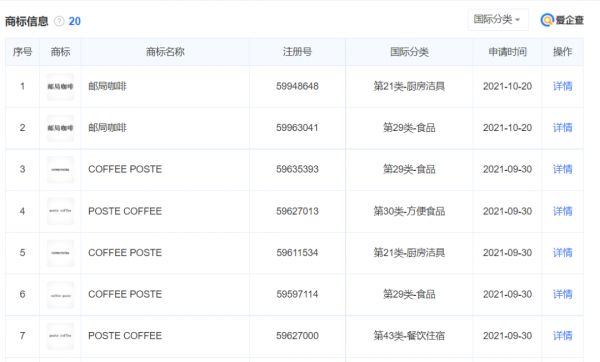 通过爱企查公开的工商信息,“中域咖烨”的全称为“上海中域咖烨管理咨询有限公司”,是一家关于咖啡品牌运营和咖啡连锁经营的管理咨询公司,于2021年9月成立,并于2021年9月、10月,申请注册邮局咖啡相关商标,包含“邮局咖啡”“COFFEE POSTE”等商标,涉国际分类食品等。2021年11月22日,该公司厦门分公司成立。