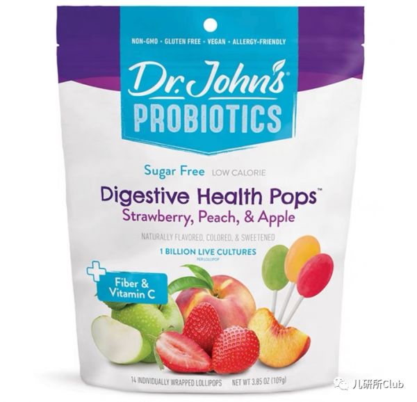 Dr.John's推出的益生菌水果健齿棒棒糖引起了儿研所Club的注意。当各大厂商均采用木糖醇来增加甜味同时保护乳牙牙釉质时,这款益生菌棒棒糖额外添加益生菌,可以在护齿的同时,补充额外的营养元素,起到调理肠胃的目的。