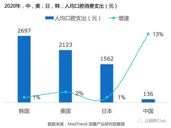 虽然市场总值世界第三,由于庞大的人口基数,我国较发达国家美日韩,人均口腔消费支出较低。