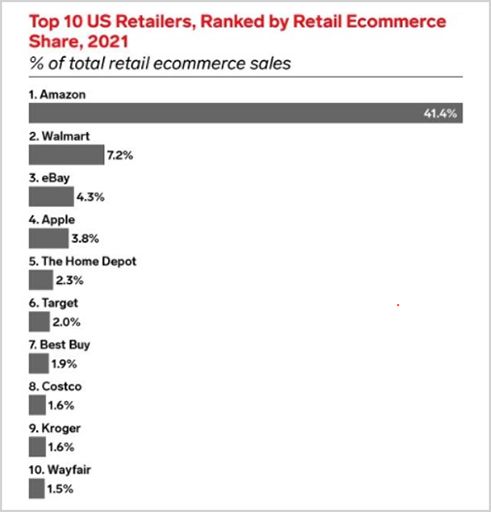 亚马逊一手遮天,在过去十年不断扩大地盘,市占率已从2011年的23.3%提升到2021年的41.4%,并和沃尔玛、eBay等同行拉开了绝对的安全距离。