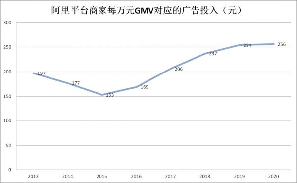 资源有限的情况,商家为了争夺消费者只能付出更高的代价。2015年之前,阿里平台上商家每万元GMV对应的营销成本持续下滑,至2015年触及最低点153元,随后单边反弹,2020年已增长到256元。