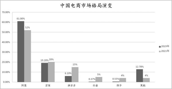 截止到2021年,按GMV计,阿里、京东、拼多多、抖音、快手的市场份额分别为52%、20%、15%、5%、4%,相较于两年前,市场格局已显著发散。