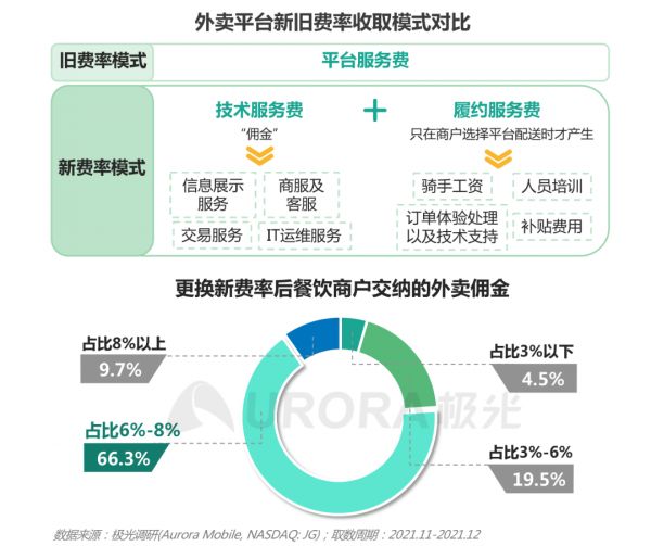 极光调研显示,平台实行费率改革后,在已更换新费率的餐饮外卖商户中,90.3%的商户表示向平台交纳的佣金低于8%,其中66.3%的商户佣金交纳比例在6%-8%区间中。相比之下,国外的外卖平台,比如美国的GrubHub、Uber Eats,英国的Deliveroo,佣金率平均都超过30%。