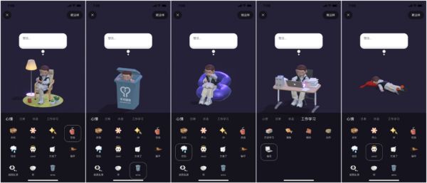 例如当选择心情为“忧伤”时,啫喱中对应的虚拟形象会坐在沙发上,怀抱抱枕“嘤嘤”哭泣抹泪;选择“悠哉”心情的时候,虚拟形象则会惬意地坐在椅子上,翘着二郎腿刷手机并“点赞”;而选择心情为“emo”时,虚拟小人则蹲在写着“不可回收”的大垃圾桶里,双手扒着桶边,眼泪汪汪地朝外张望……