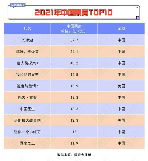 具体来说,在2021年中国票房TOP10中,国产片占到了8部,票房破40亿的有3部,破10亿的有5部。其中,《长津湖》不仅是去年票房最高的电影,更刷新了中国电影的票房纪录,超越《战狼2》成为了中国影史票房第一的作品。相比之下,打入TOP10的进口片仅有《速度与激情9》和《哥斯拉大战金刚》2部,其票房亦无法与头部国产片相提并论。