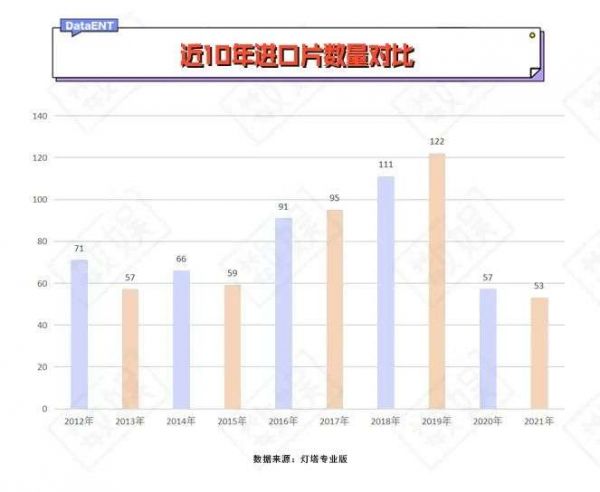 但在疫情之后,进口片的热度开始急转直下。2020年,进口片数量只有57部,相比2020年骤减65部,跌幅达53%。去年,进口片的数量更是只有53部,创下了近10年来的最低记录。