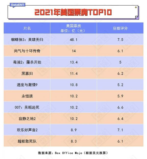 其次是质量,放眼整个美国市场,近几年,真正意义上的现象级爆款作品亦寥寥无几。而究其原因,是因为好莱坞自身创作能力的减弱,毫无新意的翻拍、衍生、续集作品大行其道,让观众逐渐产生审美疲劳。具体来说,在2021年美国票房TOP10中,豆瓣7分以上的作品仅有《蜘蛛侠3:英雄无归》和《欢乐好声音2》2部,其他大部分作品都徘徊在及格线附近。且不说在国内遭遇差评的《速度与激情9》,就连一向以质量著称的漫威系列电影也在口碑上接连遭遇滑铁卢。