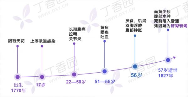 1792 年,22 岁的贝多芬第一次出现腹痛和拉稀,与此同时关节炎也开始发作。腹痛多年的贝多芬在晚年时染上黄疸,还伴有吐血。他的肝脏问题也越来越严重。