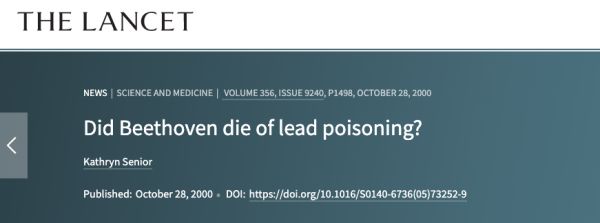 2000 年,柳叶刀上的一篇文献报道,研究者对贝多芬的头发进行了金属物检测,发现铅元素高于正常值 100 倍,文中提出贝多芬可能患有铅中毒。