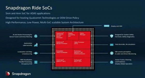 2020年CES上,高通推出全新自动驾驶平台高通Snapdragon Ride,自动驾驶芯片“骁龙 Ride”,芯片将于将于2023年上市,面向ASIL-D及安全性的 SoC芯片,可支持从L1至L4的自动驾驶系统,算力覆盖范围为10TOPS至700TOPS。