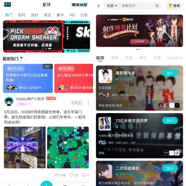 另外,“Hobby”还有两大功能,分别是“星球”和“星社”。在星球中,用户可以进行投稿,还可以获取星卡用于兑换平台的好物,而商家则可以入驻“潮流地图”,进行商业宣传。