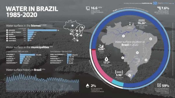 当时测绘团队MapBiomas的水资源项目,使用机器学习处理了1985-2020 年NASA的3颗地球遥感卫星对于850万平方米的巴西国土拍摄的15万多张图像后,发布了结果。