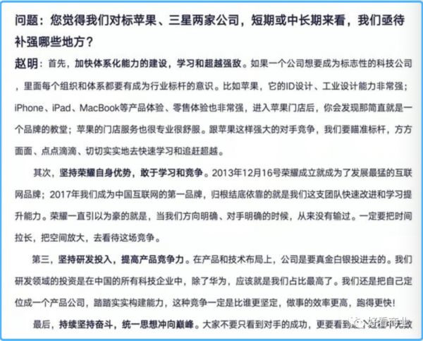 在网传的一份内部会议纪要中,荣耀的CEO赵明毫不吝啬对苹果的赞美。