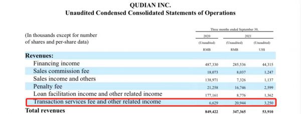 2021年三季度显示,趣店的两大主业,即融资业务和贷款撮合业务均呈现下滑状态。其中,以借款为主的融资收入是趣店的最主要收入来源,但财报显示,趣店2021年三季度融资收入为2.9亿元,同比降低41.9%;贷款撮合及其他相关业务收入也仅为877.6万元,相较上年同期的1.77亿元大降95.05%。