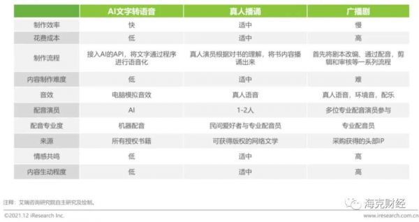 在调研机构艾瑞咨询日前发布的《中国网络音频产业报告》中,其将AI文字转语音、真人播诵和广播剧一同归入了广义的“有声书”门类之下。但人们在实际收听音频作品的时候,却更习惯将狭义的有声书概念和广播剧做一个泾渭分明的区分——前者是单人或多人照搬原著的诵读,而后者则是对原著改编剧本的二次演绎,两者带给听众的审美感受是截然不同的。