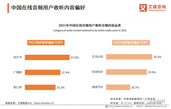 据调研机构艾媒咨询数据,中国在线音频市场近年呈较快增长趋势,2021年市场规模或约为220.0亿元,同比增长67.9%;2022年市场规模或将达到312亿元,同比增长41.8%。该机构所做的一项调研问卷显示,在中国在线音频用户收听内容偏好方面,PGC内容收听偏好TOP3分别为有声书、广播剧、脱口秀,三者得票率分别为47.0%、37.4%、32.2%。