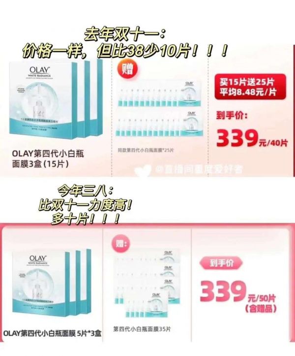 更关键的是,在这场以往受重视程度远低于618和双11的大促活动中,多个品牌给出了堪比去年双11甚至更胜一筹的优惠力度。MAC、雅诗兰黛、ALLIE、芭比波朗等多款热门产品的机制是“正装买一送一”,而不是被诟病已久的“折扣不够,小样来凑”;更多品牌增加了赠品数量,比如OLAY的小白瓶面膜,直接比去年双11多赠送10片。