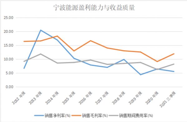 从收益质量来看,宁波能源近年来净利润和毛利率整体呈下滑趋势,在2021年度毛利率回升迹象,但是期间费用同比上升,主要是管理费用上升。由于去年疫情减免社保导致报告期职工薪酬较上年同期增加。