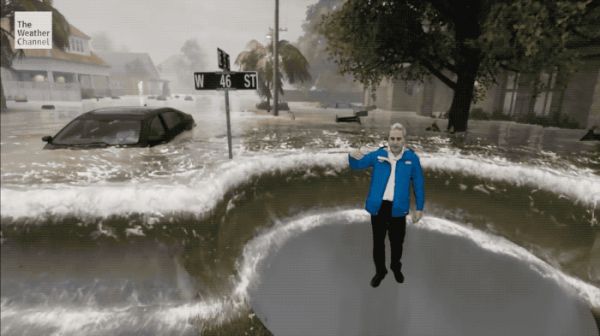 这是TWC引以为傲的节目形式,利用AR和MR的结合来制造出逼真的场景。配合主持人精彩的讲解,观众仿佛置身于恶劣天气的中央。这样的视听效果和普通天气播报完全不同,不仅不无聊,反而像游戏、电影一样扣人心弦,而这背后都是TWC团队的科技创新。