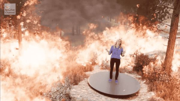 TWC用这种方法做过龙卷风、雷击、飓风、森林大火、冰暴的天气效果,他们在采访中透露了视频制作背后的故事。它的制作难度不亚于一个电影片段,先提出一个热门的话题,然后编写脚本,创作完成的故事线,这是第一步,接下来是制作,其实主持人在讲解时是站在绿幕中央,和我们在有些电影花絮中看到的一样,主持人看不到最终的效果,需要靠想象来完成表演。