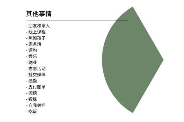 如果希望明确自己的重要事项,你可以直接看看自己的时间都花在了哪些方面。可能你认为自己以学习为主,但通过时间审计后发现,过去了这么多天,网课仍然没有上完,或者床头柜上的书仍然没有开始读。而时间管理的目的,就在于让你能够在实际过程中优先完成自己明确的那些重要事项。