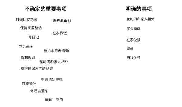 对于你想完成的事情,你可能会列出一个很长的清单。但如果每件事都是重要事项的话,就实际上重要事项也就没有任何意义了。太多的事项只会让我们无所适从,反而失去了重点,不可避免地导致“分析瘫痪”(analysis paralysis)。