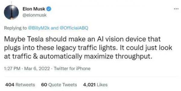36氪获悉,3月6日,特斯拉 CEO 埃隆马斯克 (Elon Musk) 通过 Twitter 表示,特斯拉或许应该制造一款可以连接传统交通灯的人工智能视觉设备,该设备可以只查看交通情况,并使吞吐量自动最大化。作为全球最大的电动汽车公司之一,交付数据显示,特斯拉 2021 年全年共生产约 93.04 万辆汽车,交付约 93.62 万辆汽车。