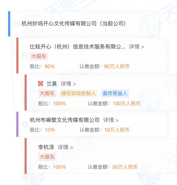 此次,浪胃仙与原MCN分道扬镳,本质上与之前的矛盾类型一致。浪胃仙在游絮的公司尽管能拿到高额提成和收益,但并不持股。而在小兰新成立的公司杭州炒鸡开心文化传媒公司中,浪胃仙(李杭泽)持股10%。