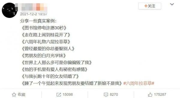 除了甜蜜恋爱,社交媒体上也不乏“劝退”的恋爱BE(Bad Ending,悲剧结局)文学,前有8年男友与同门女生暧昧不清的《图书馆停电许愿30秒》,后有恋爱周年礼物“六周年六层草,还有一件破棉袄”的《六周年拉菲草》,这些故事所展现出的爱情中的游离、背叛和敷衍,在让人难过之余,也让人发出“不要谈恋爱,会变得不幸”的感慨。