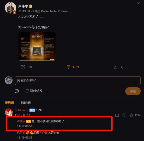 根据小米中国区总裁卢伟冰回复网友的话来看,天玑9000芯片方案售价高昂,甚至一套就可以接近2000元。