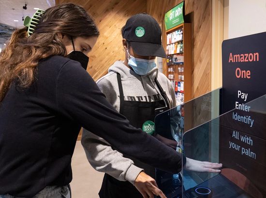 顾客可以在超市门口用手机或自己的“掌纹”登录亚马逊账户,进入超市,选购商品,然后直接离开。过程中,亚马逊的“免结账即走”(Just Walk Out)系统会自动追踪、识别顾客选购的商品,在后台完成结账扣款,实现“无感支付”。