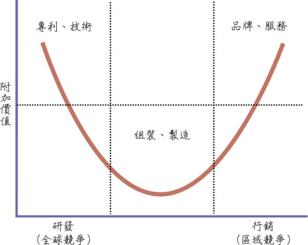 来源:Rico Shen,CC BY-SA 4.0,https://commons.wikimedia.org/w/index.php?curid=3124651 微笑曲线分成左、中、右三段,左段为技术、专利,中段为组装、制造,右段为品牌、服务,而曲线代表的是附加价值,微笑曲线在中段位置的附加价值较低,而在左右两段位置的附加价值较高,如此整个曲线看起来像是个微笑符号。微笑曲线的含意即是:要增加企业的附加价值,绝不是持续在组装、制造位置,而是往左端或右端位置迈进。