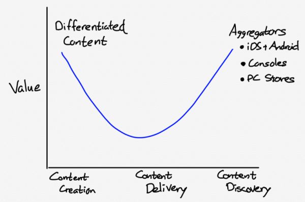 夹在这条曲线中间的任何东西变得更不可行。一开始的时候 PlayStation 几乎完全依赖第三方游戏,依靠技术优势来建立自己的用户群,吸引开发者;由于 PlayStation 3 相对令人失望,这种做法已经走到极限,从那以后,索尼就一直聚焦在独家产品上。与此同时,像Zynga这样的内容开发商也不能依赖站在曲线中间的公司:苹果的规则确保了聚合者以外的任何人都必须弄清楚如何靠自己赚钱。游戏机以及PC 上的第 3 方开发者还有市场——Steam 是后者主要的聚合者,但现在不仅受到微软,还受到 Epic 的挑战,他们都在争夺最优秀的开发者——但内容高度差异化,严格控制成本正变得越来越重要。