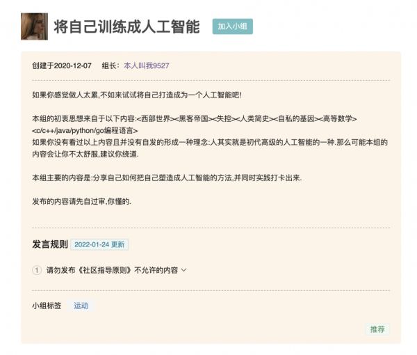 2021 年 1 月,名叫“将自己训练成人工智能”的豆瓣小组吸引了夹心的注意——那里集聚了一帮“想做机器”的人。