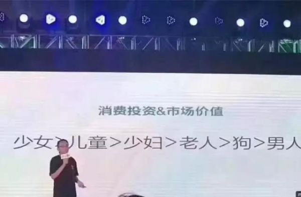 这其实是在回应一个古老的段子:根据一份大数据排行榜,投资人心中消费投资市场价值从高到低依次是少女>儿童>少妇>老人>狗>男人。结论很清晰:男性位于市场价值链的最末端,而女性则高居金字塔顶端。