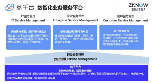 甄知科技核心产品燕千云帮助企业构建数字化服务能力,成为企业数字化转型的核心服务平台。具体而言,燕千云低代码平台支持三大服务管理场景,包括IT服务管理(ITSM)、企业服务管理(ESM)、客户服务管理(CSM),并将智能服务能力贯穿三大业务场景,进行AI赋能。
