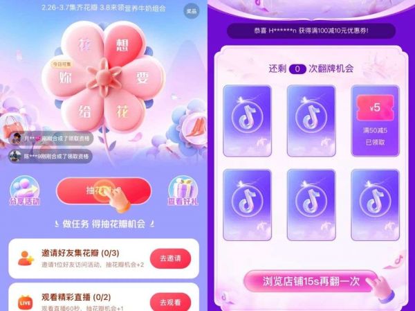 快手主打“集花瓣”玩法,通过分享、邀请等方式促进拉新,商家侧推“人参果计划”,主播达到拉新目标,最高每个新客奖励5元现金,使用福袋还可获得官方5-10元商品补贴。而抖音的玩法包括有好物直播间 、行业任务赛、全民任务赛、跨店满减、翻牌互动游戏等,意图在于不断拉长用户使用时长。
