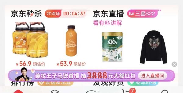 相比起淘宝早已把App封面标注上了3.8节的字样,京东依然维持的原样的App封面显得平淡许多,大促的体现,也只是把首页底端的流量入口给了美妆造型师马锐的直播间,这大概是京东在女性向很强的购物节点,利用达人美妆直播间属性,对自己不擅长的消费群体进行触达。