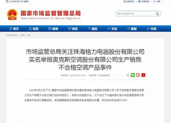 @新浪科技【市场监管总局:高度关注格力电器实名举报奥克斯事件,正调查核实】据国家市场监管总局网站消息,10日下午,国家市场监督管理总局注意到珠海格力电器股份有限公司《关于奥克斯空调股份有限公司生产销售不合格空调产品的举报信》。国家市场监督管理总局对此高度关注,已于当日下午通知浙江省市场监督管理局对有关情况尽快进行调查核实,将依据调查核实的结果依法依规做出处置,并及时向社会进行公开。