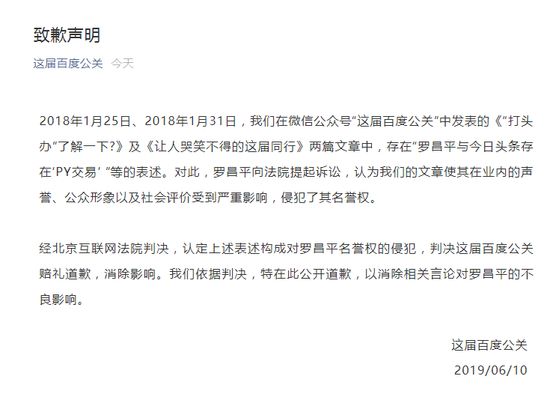 @网易科技【百度就"罗昌平名誉权案"发布致歉声明】百度“这届百度公关”微信公众号就“罗昌平名誉权案”发布致歉声明,公开道歉以消除相关言论对罗昌平的不良影响。以下为“这届百度公关”微信公众号发布的致歉声明: